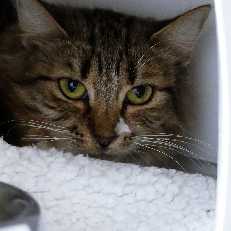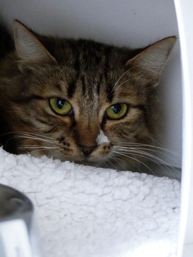- La toute douce Ganache arrive tout juste au refuge ; auparavant dans sa famille d’accueil, la pauvre minette est bien impressionnée et bouleversée par ces changements, ce qui impacte pour le moment son comportement, et le rend difficile à analyser.